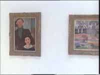 1893 (Identified by Michael Grey) The three paintings on the top row of the wall the man in the grey suit is at are by Monet. The center one is an image of a hay stack or a thatched-roof hut in the center of a field (actually, 2 of them). I don't know the names, but I'm sure I saw them and they are by Monet. I think the paintings on the top left and right of the man are images of large rocks in the ocean, like a rocky shoreline (also Monet). (Identified by S. Wootten) |